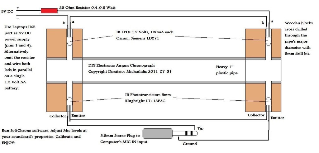Using this diagram I found a homemade chronograph that used parts bought from China for less than NZ$10 I have a working chronograph. From reading comments people have tested against a commercial chronograph and the results were with 1% of each other. (I used that used SoftChrono and the download is available here.) It is based on using sound to measure the time it takes for the pellet to travel a known distance. By using light instead of sound it should be more accurate. As long as the pellet passes through the light beam.